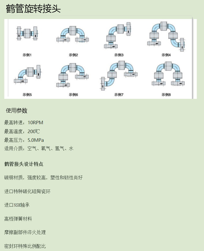 產(chǎn)品簡(jiǎn)介:鶴管接頭設(shè)計(jì)特點(diǎn):碳鋼材質(zhì),強(qiáng)度較高,塑性和韌性尚好;進(jìn)口特種碳化硅陶瓷環(huán);進(jìn)口NSK軸承;高檔彈簧材料;摩擦副部件淬火處理;密封環(huán)特殊比例配比。 使用參數(shù): 最高轉(zhuǎn)速:10RPM 最高溫度:200℃ 最高壓力:5.0MPa 適用介質(zhì):空氣、氧氣、氫氣、水...